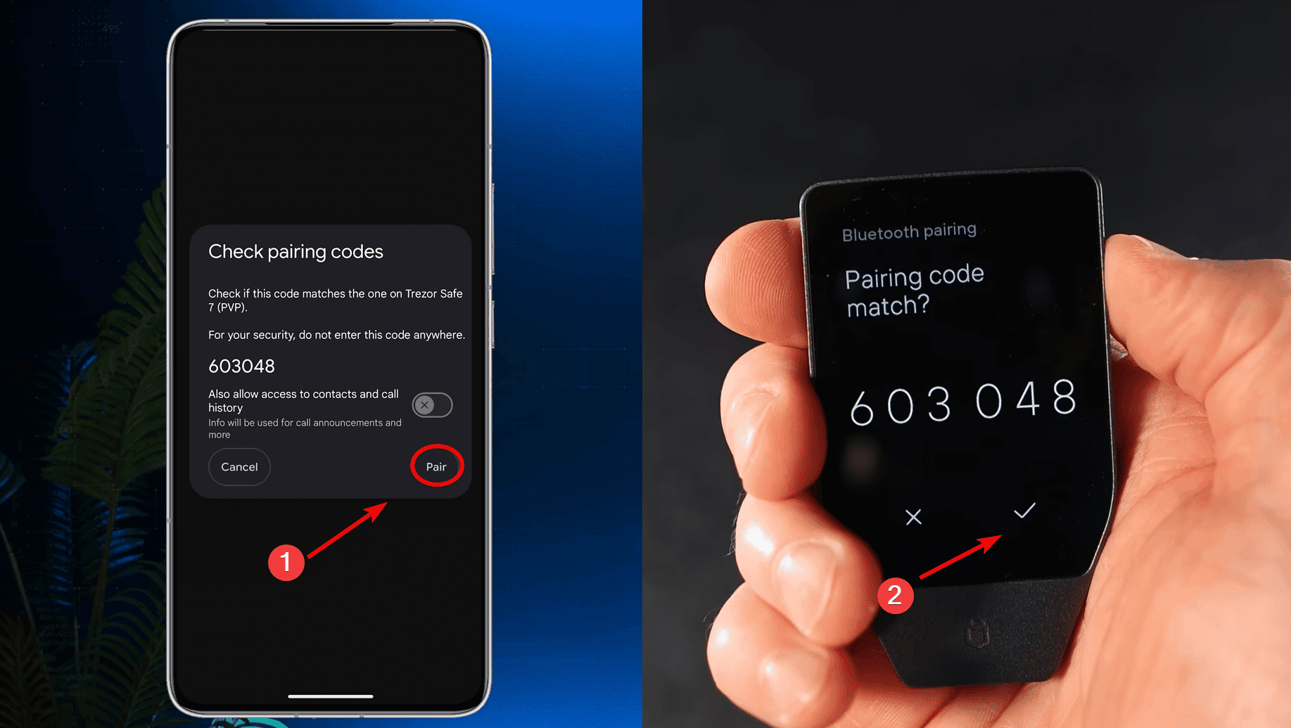 Убедитесь, что код сопряжения, показанный на вашем Трезоре, совпадает с кодом в приложении. Если да, нажмите Pair в приложении и подтвердите на вашем устройстве.