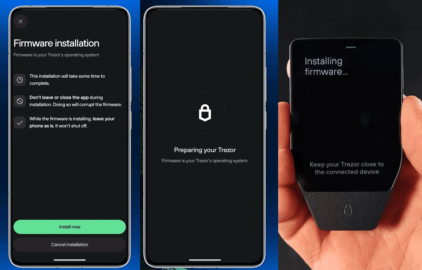Следующий шаг - установка прошивки. Нажмите Install now в приложении и обязательно держите ваш Trezor рядом с телефоном.