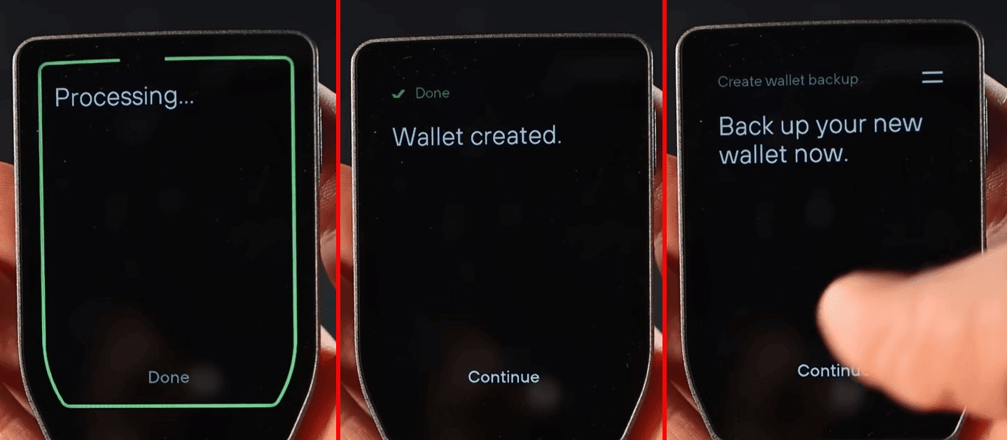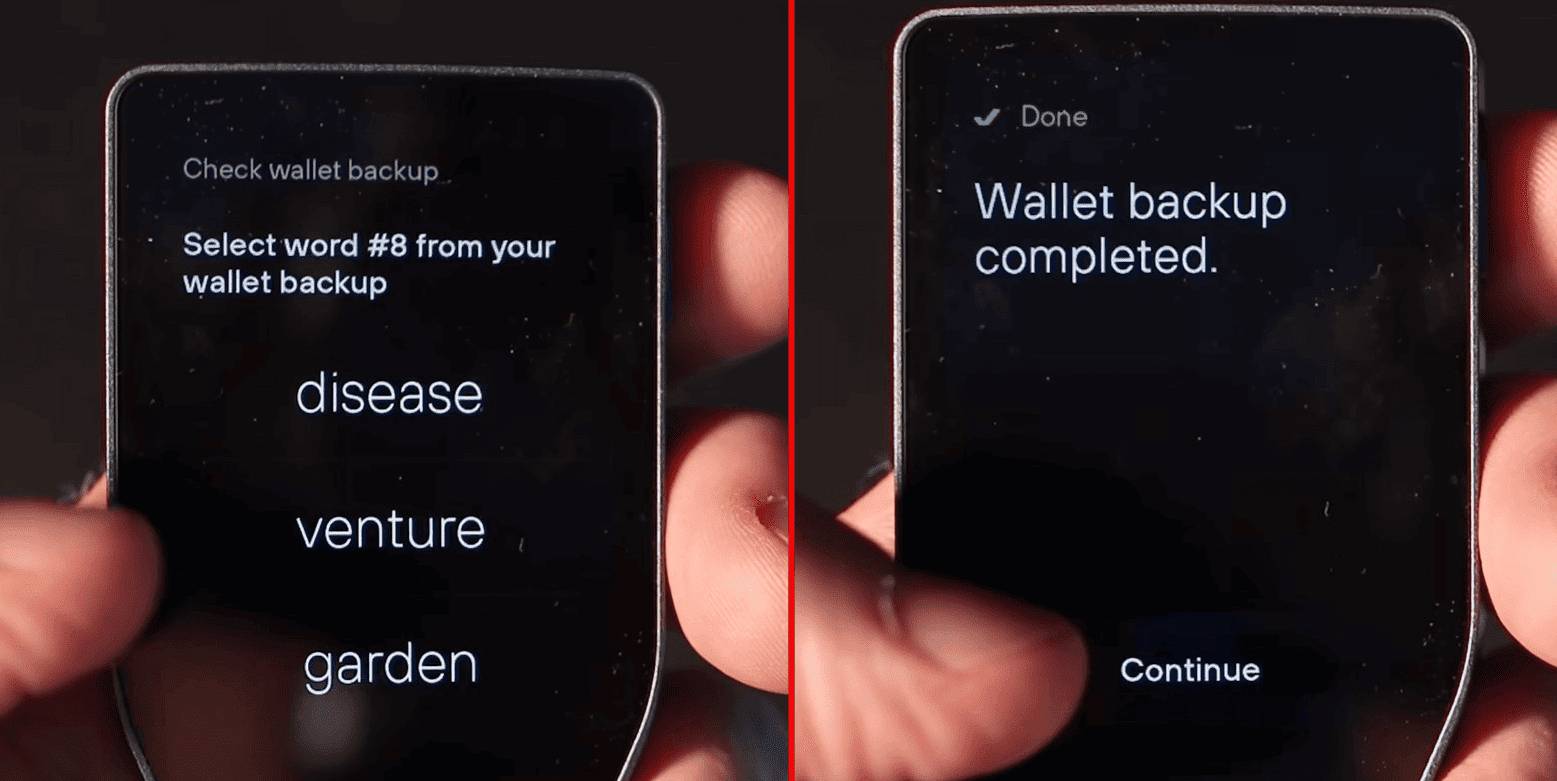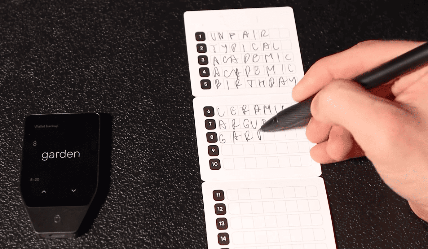 Перед началом возьмите ручку и вашу резервную карточку. Не торопитесь и убедитесь, что вы находитесь в уединенном месте. Кошелек снова покажет обучающие материалы. Когда будете готовы, удерживайте зеленую кнопку, чтобы начать.