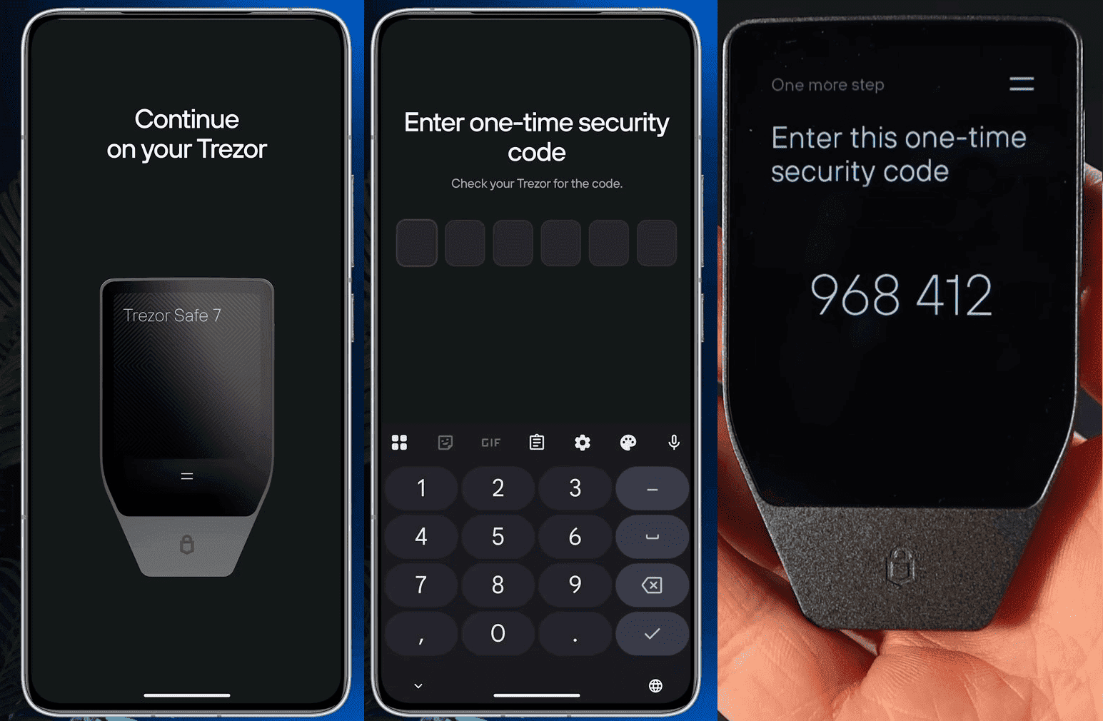 На экране вашего устройства вам нужно подтвердить разрешение на сопряжение Trezor Suite с вашим кошельком Safe 7; нажмите Confirm на вашем устройстве. Далее вам нужно ввести одноразовый шестизначный код безопасности, показанный на вашем Safe 7.