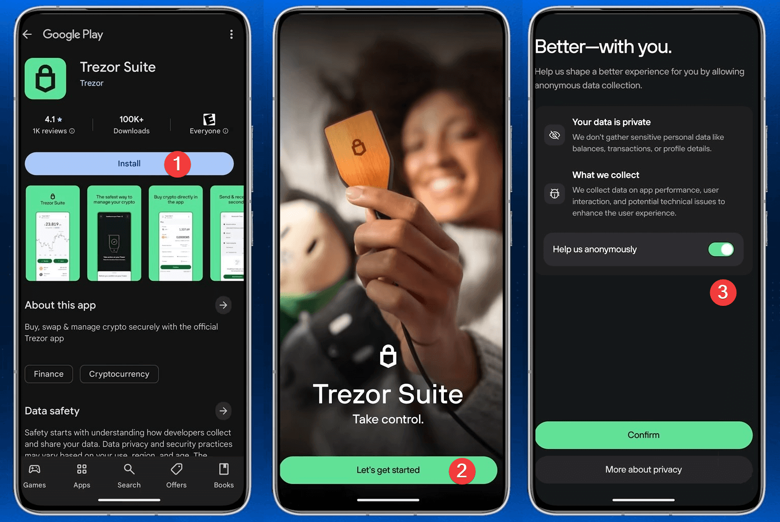Установите приложение Trezor Suite из Google Play или App Store. Откройте приложение и нажмите Let’s get started. Затем решите, хотите ли вы анонимно делиться данными о производительности с Trezor, после чего нажмите Confirm.