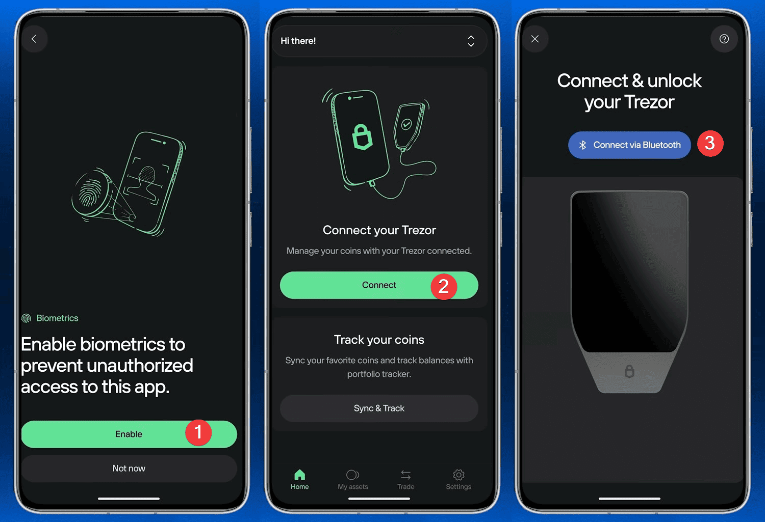 Следующий шаг опциональный - включение биометрии; мы нажмем Enable. После этого вы можете либо подключить ваш Trezor Safe 7, либо использовать приложение просто в качестве трекера портфеля.