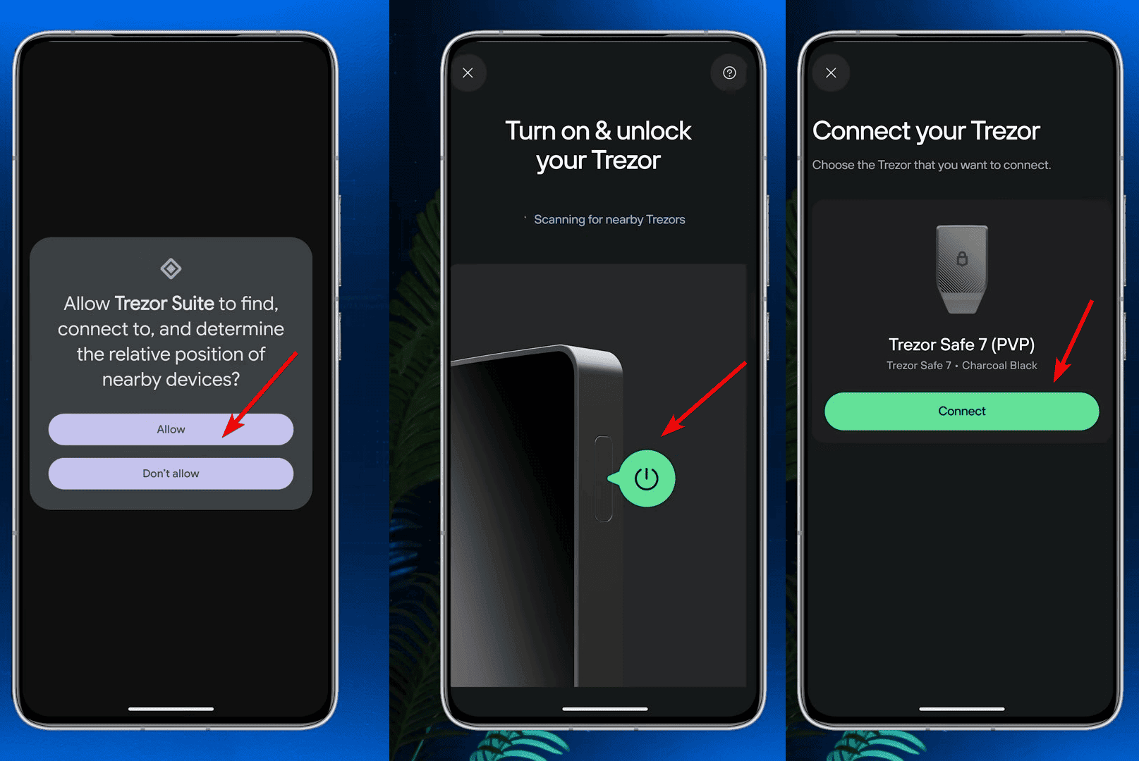 Когда приложение запросит разрешение, нажмите Разрешить. Включите и разблокируйте ваше устройство Trezor, и как только оно появится в приложении, нажмите Connect.