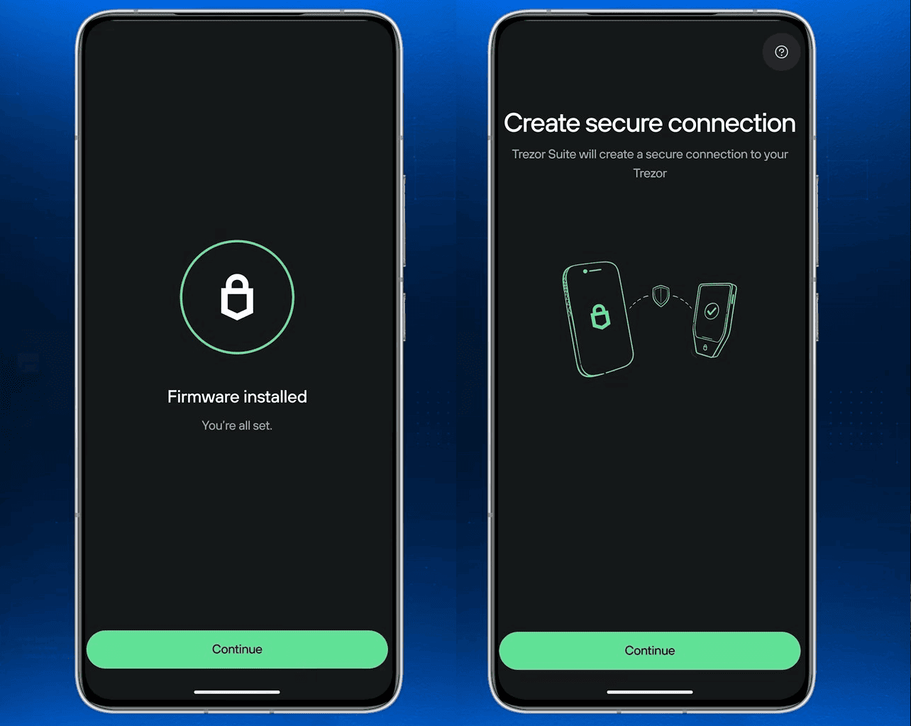 После установки последней версии прошивки нажмите Continue в приложении. Далее Trezor Suite создаст безопасное соединение с вашим Trezor; нажмите Continue.