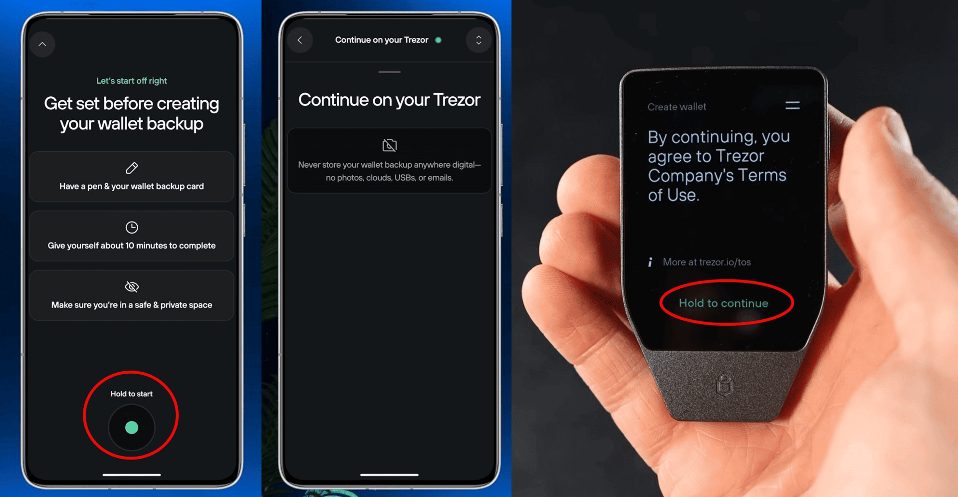 На следующем шаге вам нужно согласиться с условиями использования Trezor- удерживайте кнопку для продолжения.
