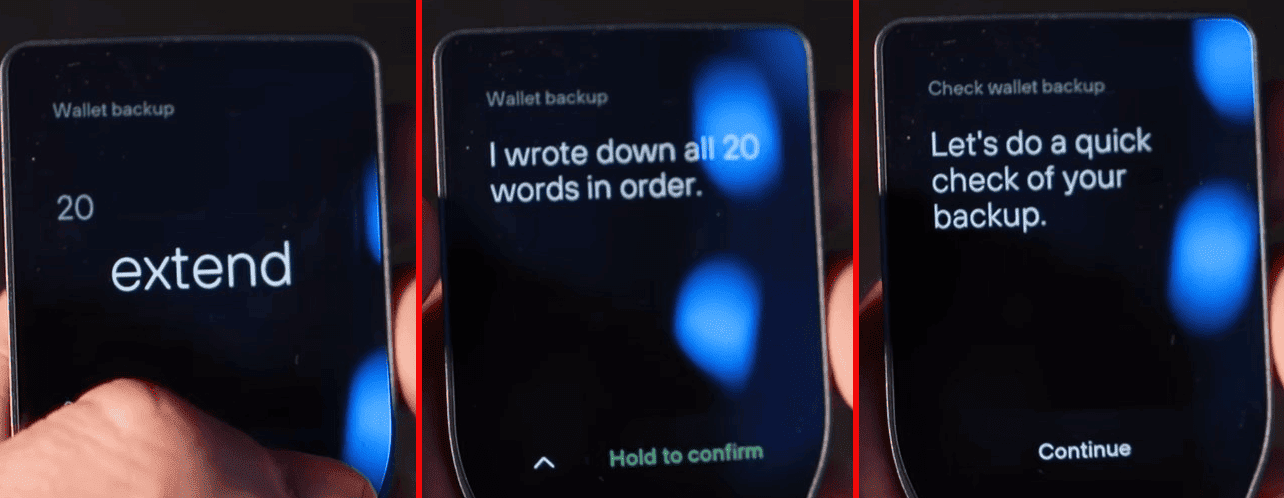 На экране вашего устройства удерживайте кнопку, чтобы подтвердить, что вы записали все 20 слов в правильном порядке.