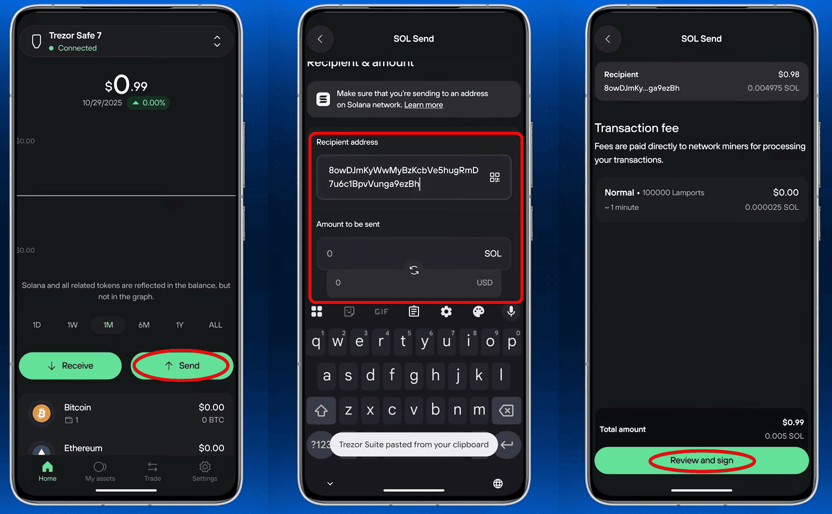 Теперь давайте отправим монеты. Нажмите кнопку Send, выберите актив, вставьте адрес получателя и введите сумму.