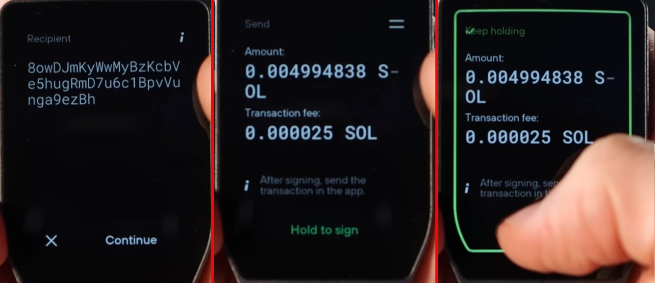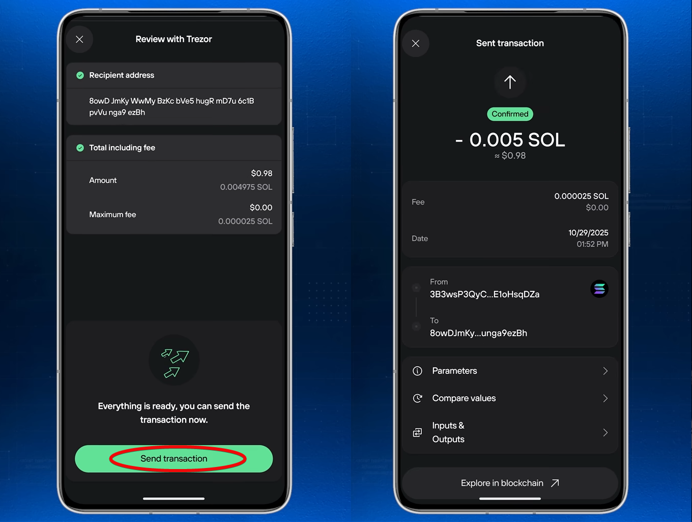 Дважды проверьте сумму и комиссию за транзакцию на вашем устройстве Trezor, затем удерживайте кнопку, чтобы подписать транзакцию.