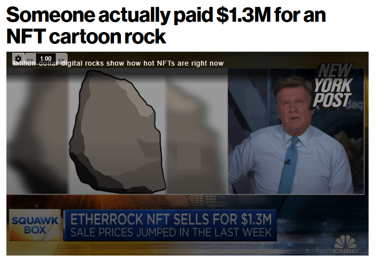 - Loud, sensational news appears about someone who paid $1.3M for a cartoon crypto rock.
