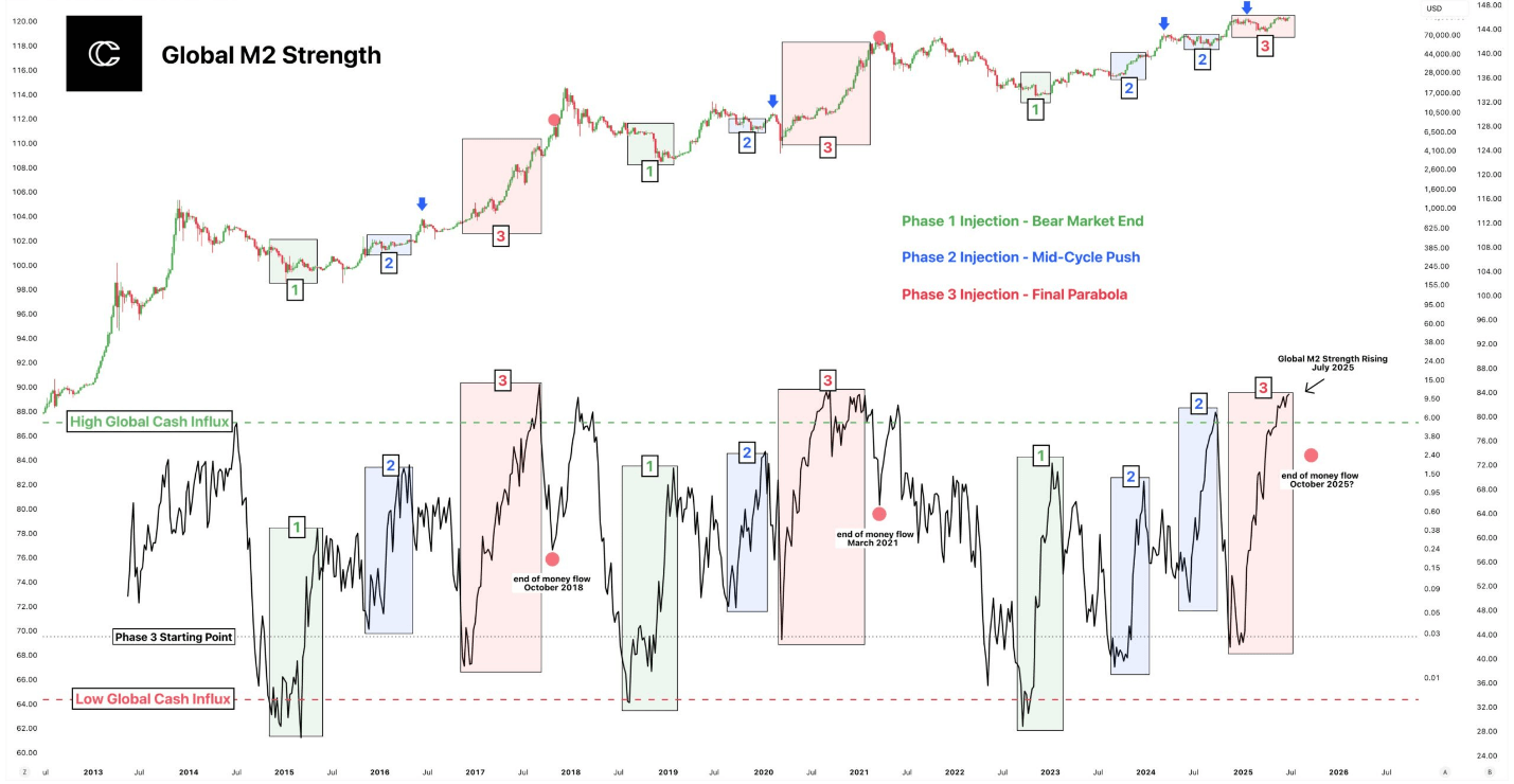Analysis of global year-over-year money supply (M2) growth shows a clear correlation with bull markets in 2013, 2017 and 2021.