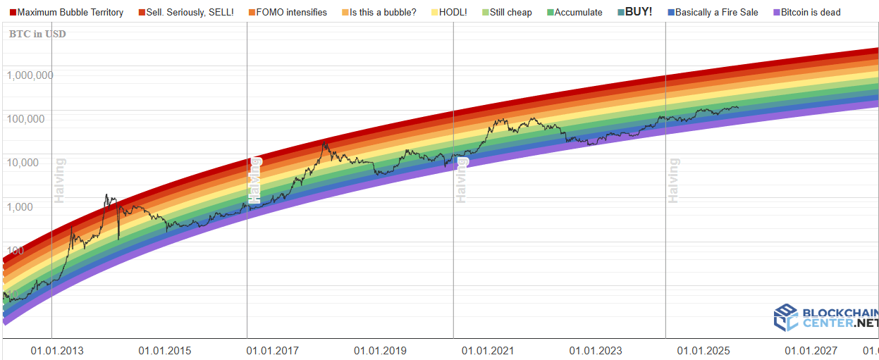 - Rainbow Chart – a visual rainbow chart where colors indicate actions. Dark blue/purple = very cheap/buy, green/yellow = hold/evaluate, orange/red = overvalued/sell.