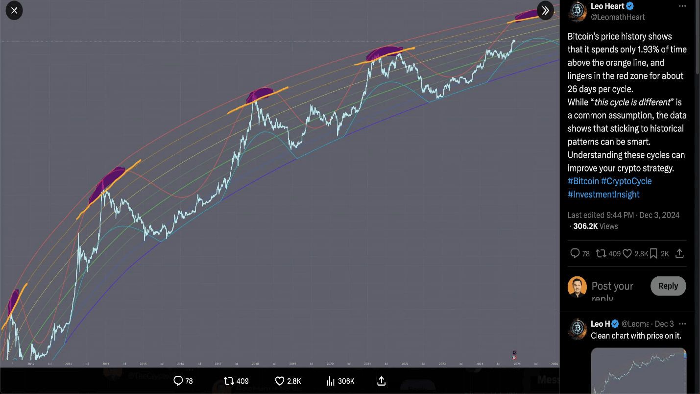 Price history shows that Bitcoin spends only about 1.93% of the time above a certain orange line - roughly ~26 days per cycle - when achieving maximum profit is most likely.