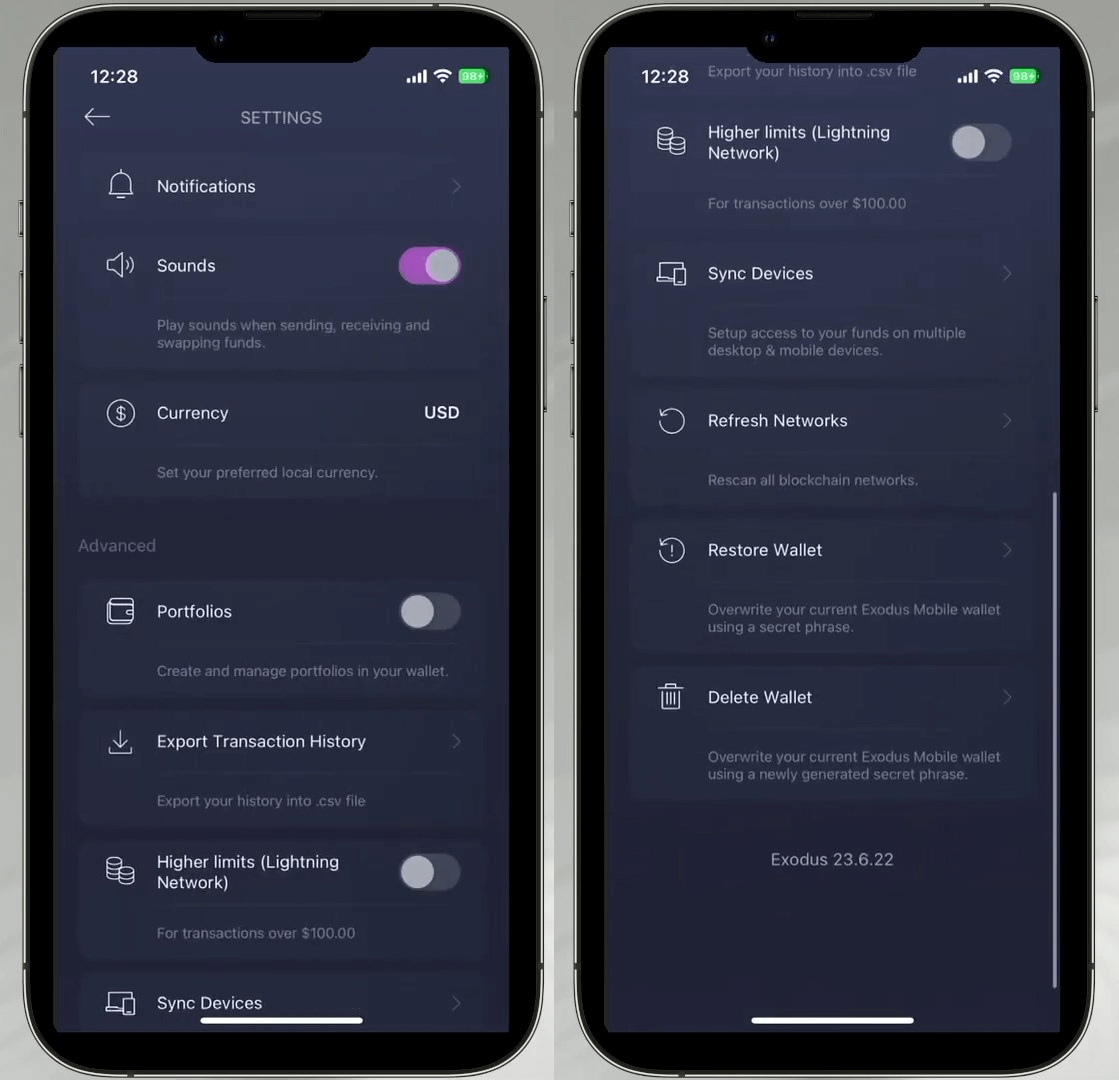 To fully delete the wallet, use Delete Wallet, which resets the app but keeps previous seed phrases for future restores.