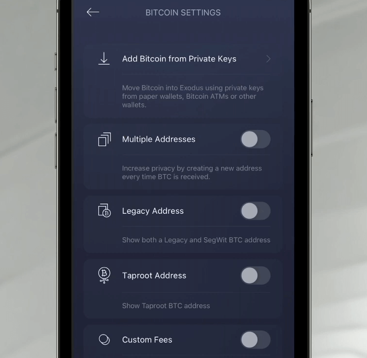 Tap any coin for extra settings. For Bitcoin, you can import other wallets via private key or enable generating a new address for each receive.