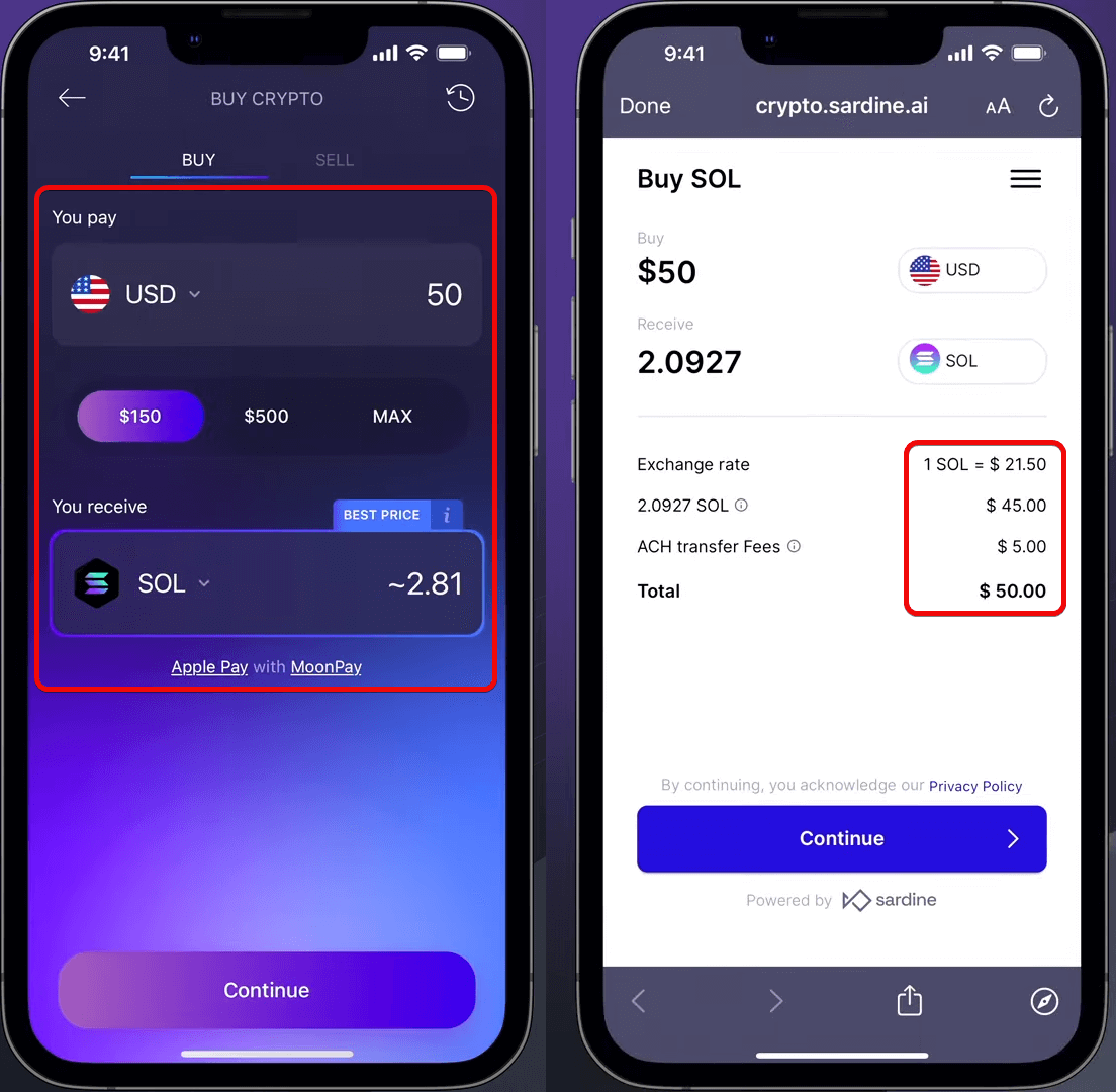 Once approved, complete the purchase. Fees are included in the quote, and crypto typically arrives in under 20 minutes.