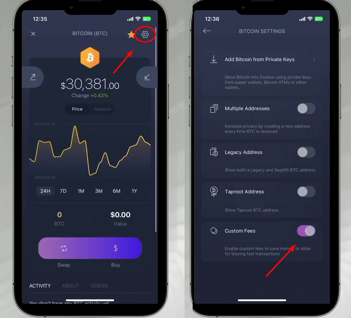 If you enable Custom Fees, you can set your own network fee. Otherwise, Exodus selects the network’s average fee.