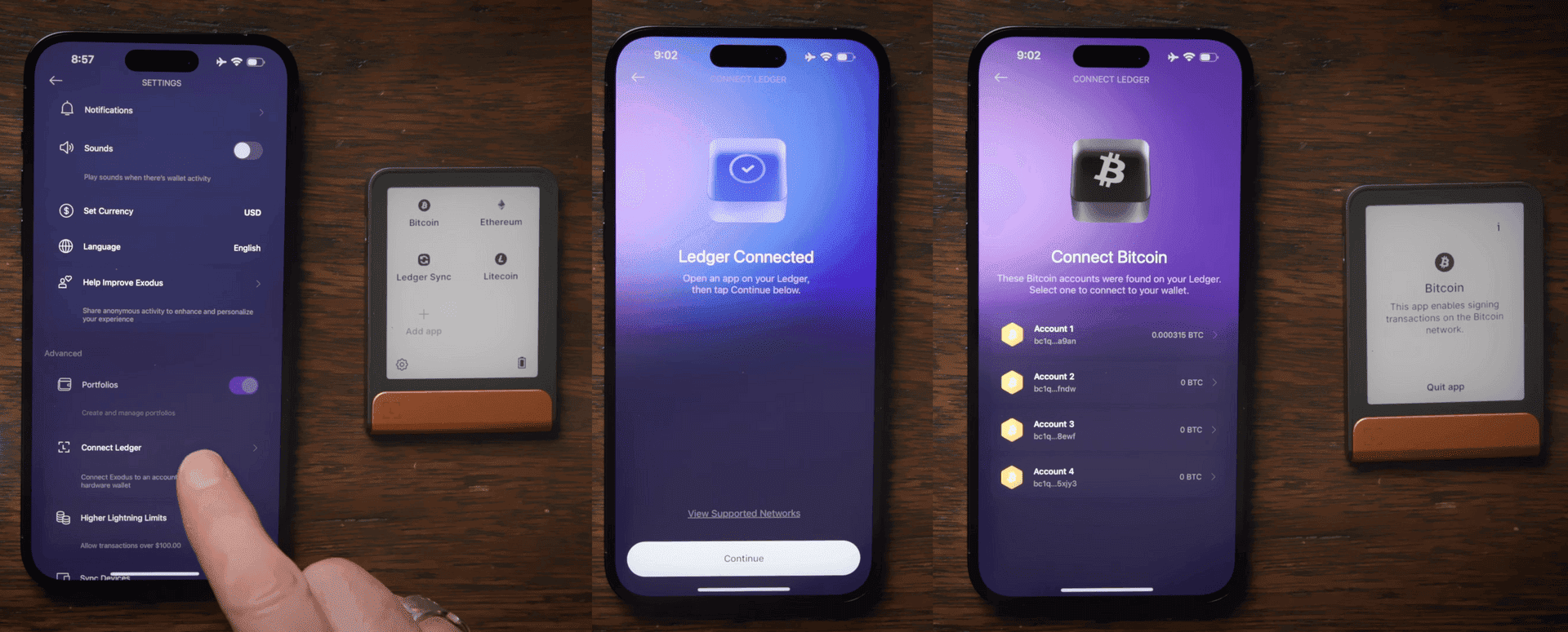 Select your Ledger device from the list. On Ledger, open the app for your crypto (e.g., Bitcoin), then return to Exodus and tap Continue.