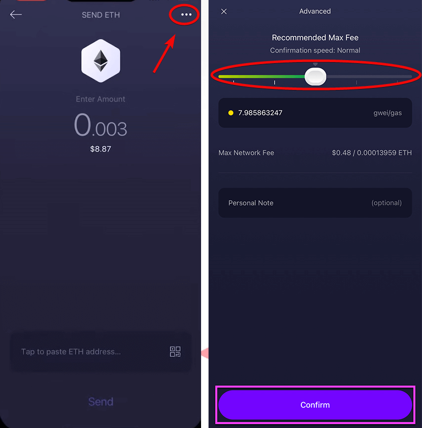 In Ethereum and other EVM chains (e.g., Polygon, BNB Chain), fees are auto-calculated, but you can still adjust them manually in settings.