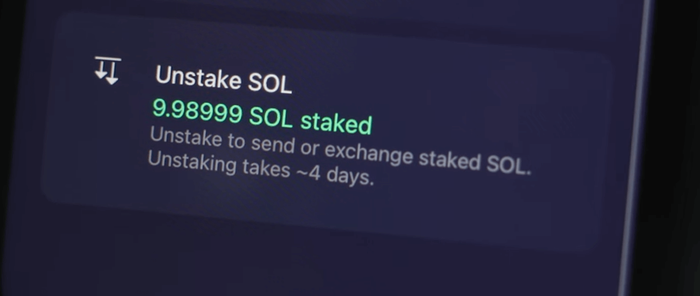 Rewards begin after 4–8 days and auto-compound. To unstake, tap Unstake SOL; the process takes about two days.