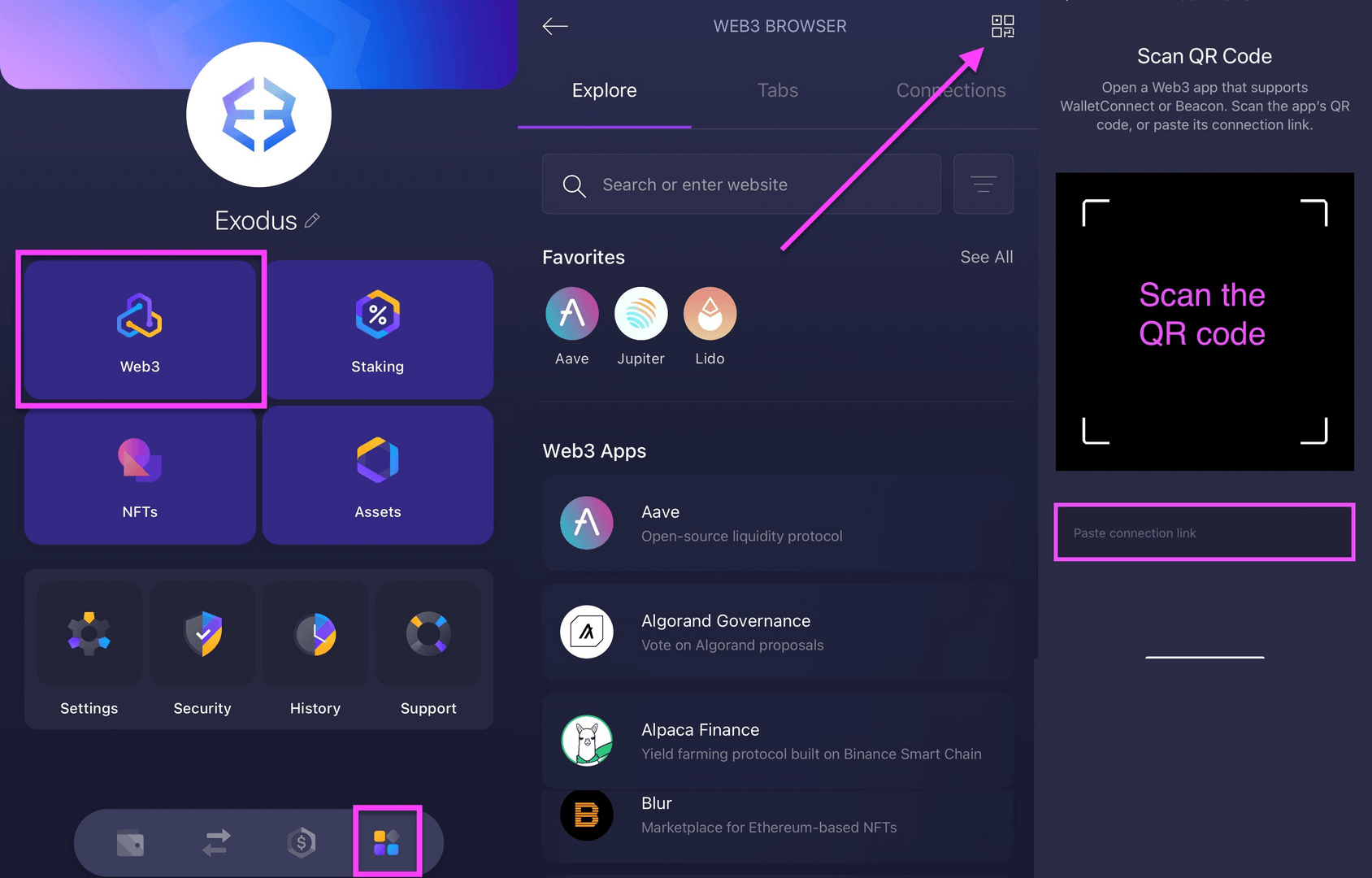 In the Web3 section, add a connection to display a QR code for scanning. This lets you interact with DeFi platforms without leaving Exodus.