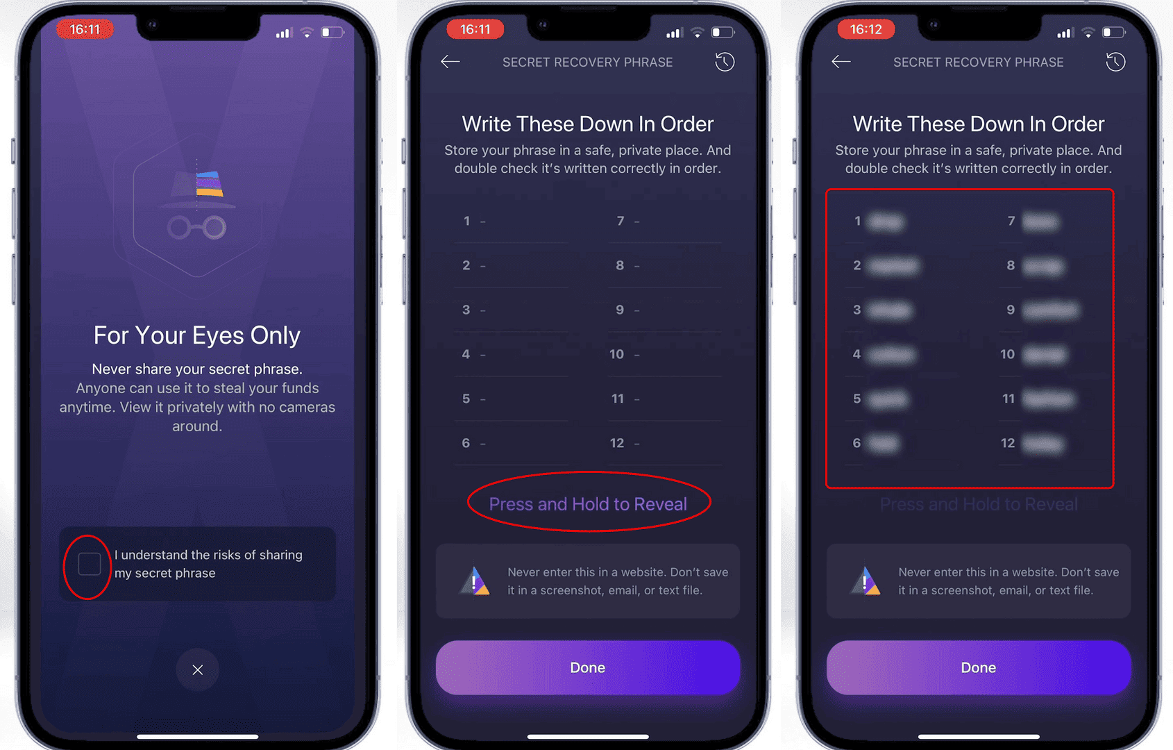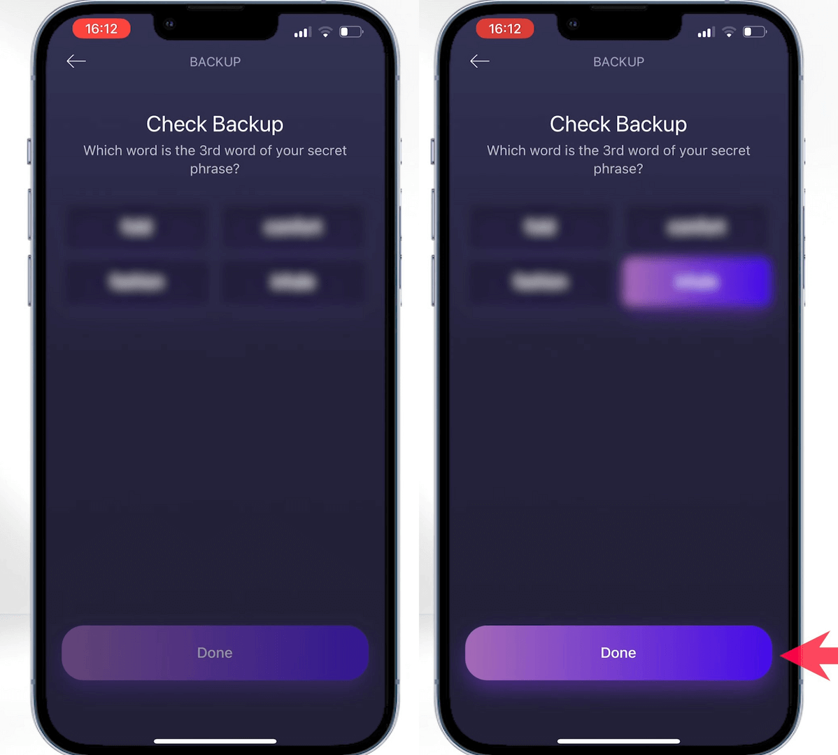 Once done, tap Done to confirm. Select the correct word when prompted, tap Done again, and ensure your seed phrase is stored safely.