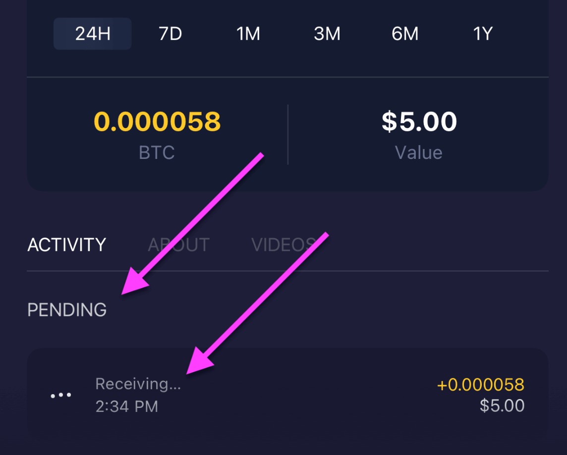 Once funds are sent, you’ll see a Receiving transaction under Pending. After blockchain confirmations, the funds become available in Exodus.