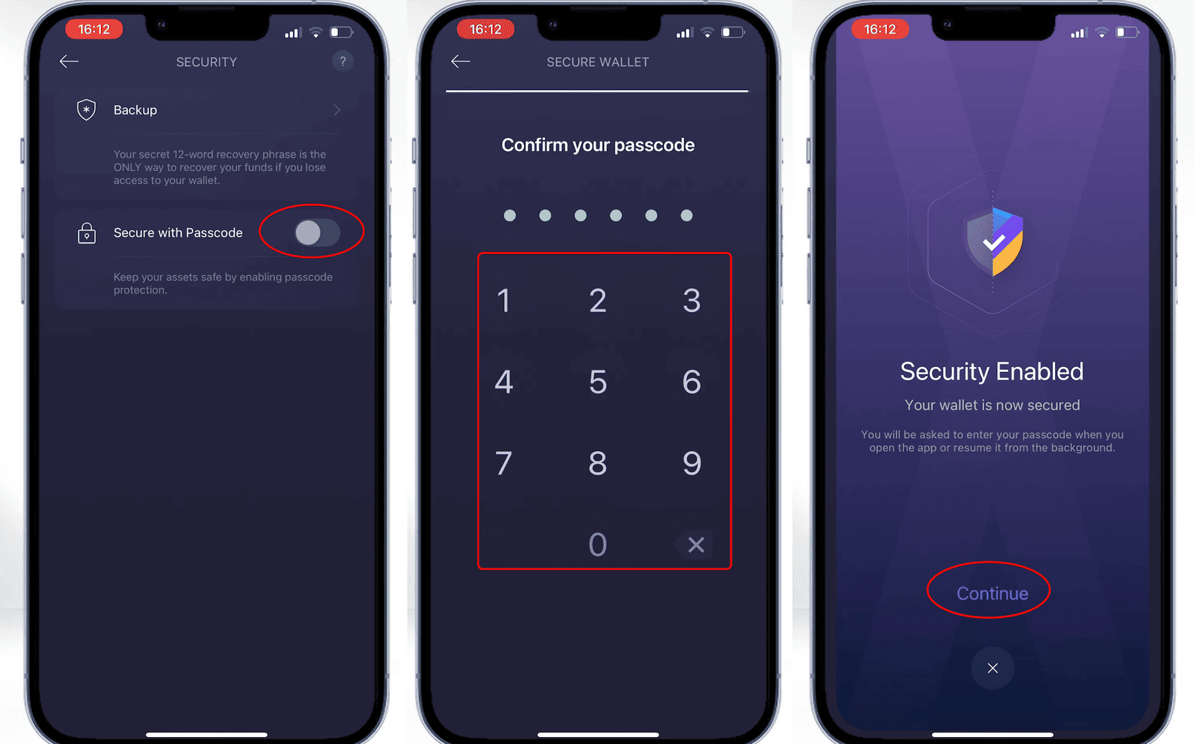 To set up a passcode, tap Profile → Settings → Secure with Passcode. Enter and confirm your six‑digit PIN. Once complete, your wallet will be securely protected.
