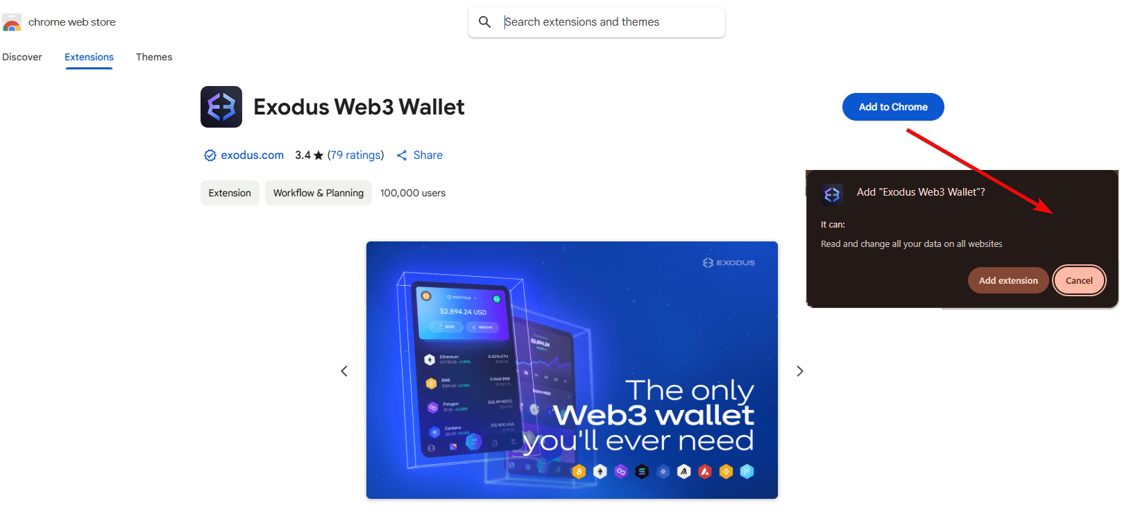 To install the extension, go to exodus.com/web3-wallet/. Click Install for Chrome and Brave on the official site, then select Add to Chrome and confirm by clicking Add extension in the pop-up.