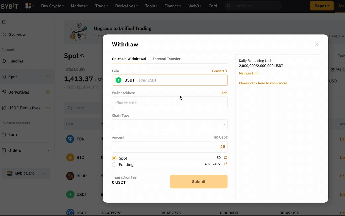 To withdraw funds, go to the Wallet tab and select the coin and network you want to send (for example, Ethereum on ETH).