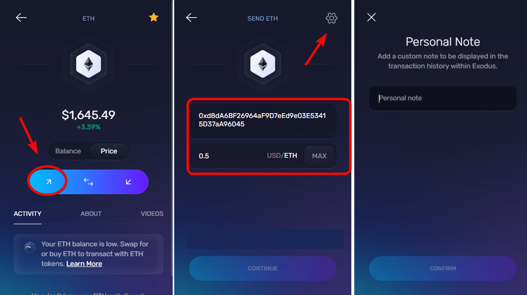 Then enter the amount and the recipient address. You can also add a private note for your transactions, visible only to you.