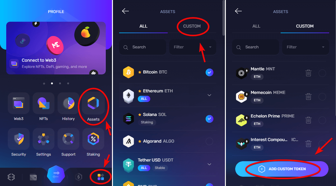 Buysection using bank cards. - Profile – access Web3, NFTs, Staking, change language or theme, view account details, and security settings.