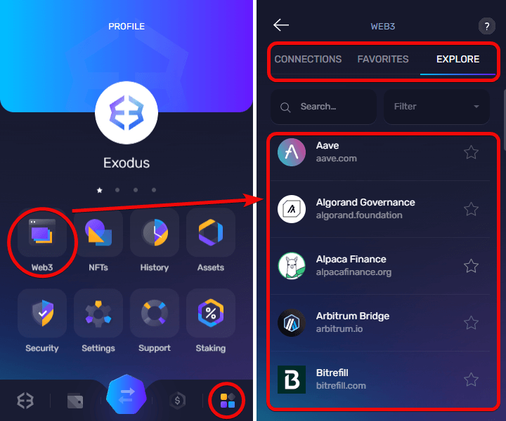 Profilemenu and selectWeb3 - Browse the list of dApps pre-integrated by Exodus