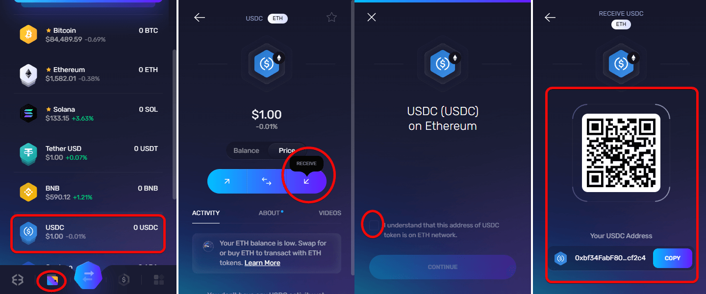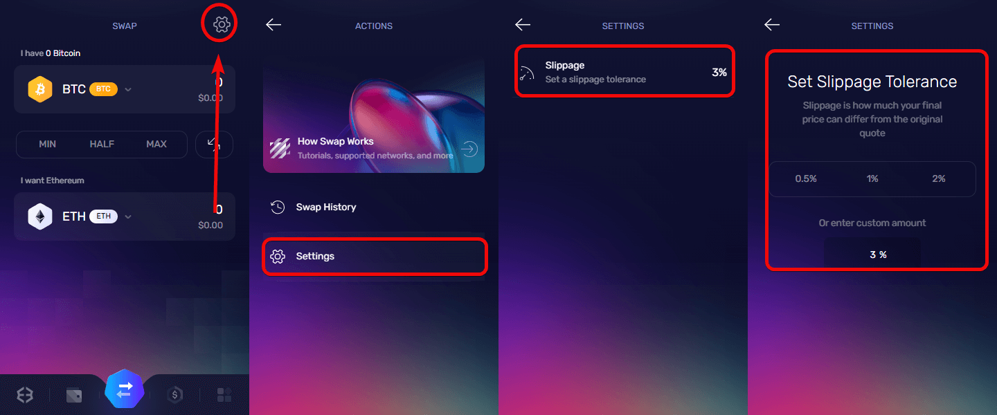 Send,Receive, switch networks, and add new coins. - Swap – choose your source and target tokens, enter an amount, and click
