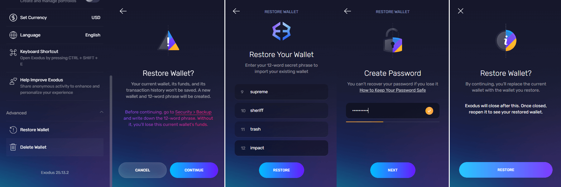 In Settings, click Restore Wallet. You’ll also reset your password. Exodus warns that without a seed phrase you’ll lose all funds. Enter your 12-word phrase and create a new password.