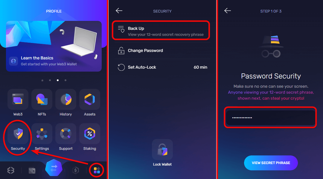The seed phrase is required to restore your wallet if you lose your device or password. You’ll find it in the profile menu at the bottom.