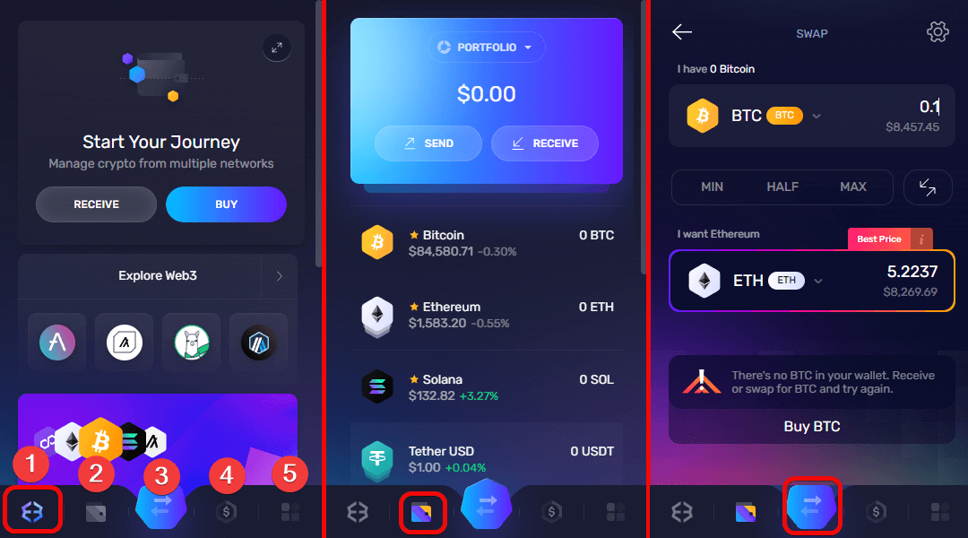You can swap assets (e.g., BTC for ETH) directly in the wallet. Let’s compare rates.